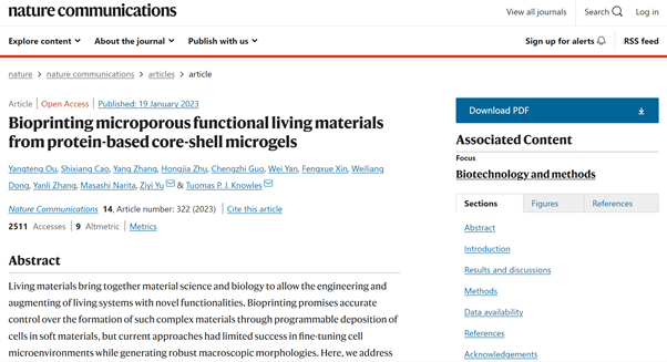 相关工作以“Bioprinting microporous functional living materials from protein-based core-shell microgels”为题,于1月19日发表于国际高水平学术期刊《自然·通讯》(Nature Communications)。剑桥大学化学系在读博士研究生、剑桥大学南京科技创新中心科研项目研究助理欧阳滕为第一作者。余子夷教授、Tuomas Knowles教授为通讯作者。该学术论文系剑桥大学、南京工业大学材料化学工程国家重点实验室、剑桥南京中心项目“液滴微流控平台的工程化及其生物应用研究” 联合研究科研成果之一。