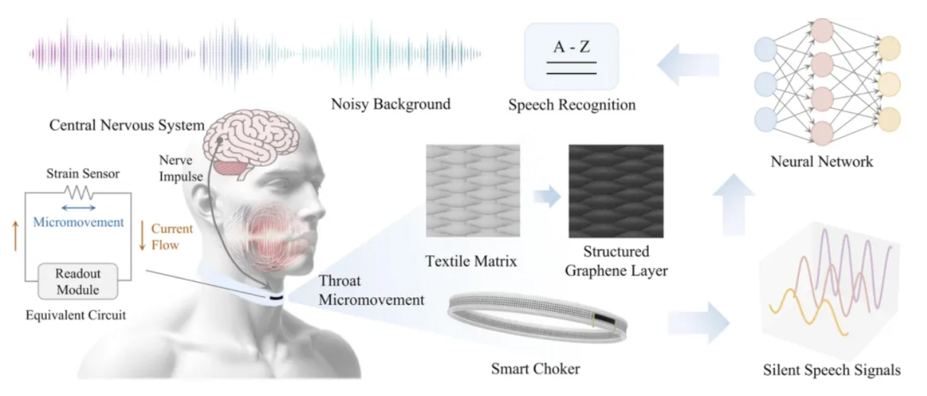 该智能项圈的独特结构特征是石墨烯涂层纺织物上规整的贯通裂缝。这种石墨烯层的结构能够显著提升应变传感器的灵敏度。它可以动态处理喉部的细微活动,捕捉信息丰富的语言信号。然后,这些信号会被高效计算的神经网络处理,语言解码的处理精准度高达95.25%。